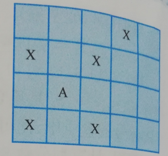 上图中,若A为某传教士的据点,则其传教范围为所有标有x的格子。为不产生冲突,则第二个传教士的据点只能放在上图的空格子中。