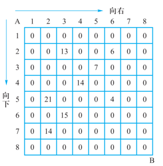 的方格图。某些方格中放入了正整数,而其他的方格中则放入了数字0。某人从图的左上角(A点)出发,可以向下行走,也可以向右走,直到到达右下角(B