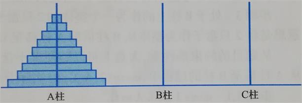 如下图示,设有n个大小不等的中空圆盘,按照从小到大的顺序叠套在立柱A上,另有两根立柱B和C。现要求把全部圆盘从A柱(称为源柱)移到C柱(称为目标柱),移动过程中可借助B柱(称为中间柱)。移动时有如下的要求: