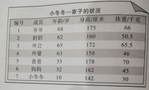 第一行,表示小冬冬家全家的平均身高(保留一位小数,平均身高数据前加“