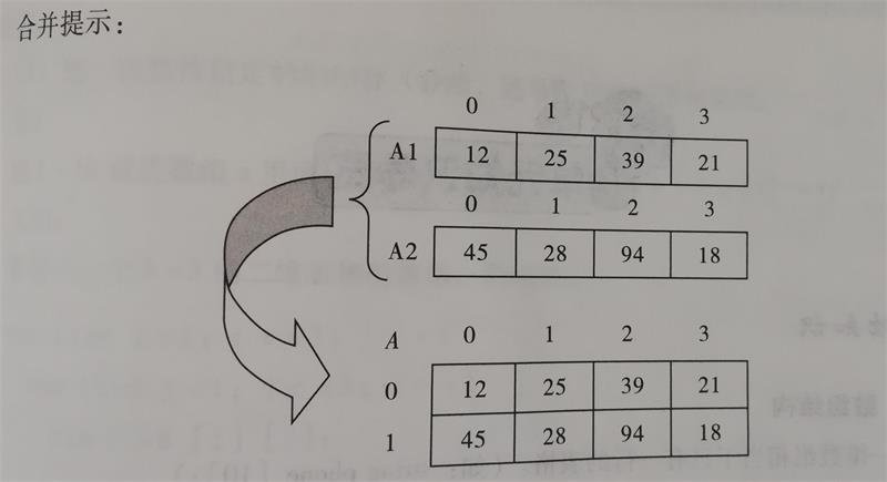 例如:当输入n为4时,向一维数组A1输入的整数为12、25、39、21,向一维数组A2输入的整数为45、28、94、18,则合并到二维数组A中后,输出A为: