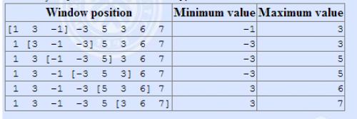 )个元素的数组,以及一个大小为k的滑动窗口,将滑动窗口从数组的最左边移动到最右边,只可以在该窗口中看到k个数字,滑动窗口每次都向右移动一个位置,请确定滑动窗口在每个位置的最大值和最小值。下面是一个例子,数组是[1 3 -1 -3 5 3 6 7],k是3。
