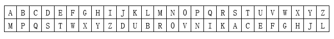 关键字:由不同的英文字母组成。关键数:不超过26的正整数。首先选择一个关键字(key word)和一个关键数K (key number),产生一个2行26列的表格,上一行是排列好的26个英文字母,将关键字从第K列开始填入表格第二行,然后按字母次序把没有填写的字母接在后面依次填入,当超过表格尾部时,环绕从第一列开始填。