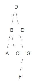 为了为后代记录她的树,她为每棵树写了两个字符串:前序遍历(根,左子树,右子树)和中序遍历(左子树,根,右子树)。 对于上面绘制的树,前序遍历是DBACEGF,中序遍历是ABCDEFG。