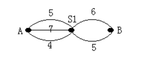 在A,B两个城市之间蛇油N个路站(如图中的S1,且N≤10),城市与路站之间、路站和路站之间各有若干条路段(各路段数≤10,且每条路段上的距离均为一个整数)。A,B的一条通路是指:从A出发,可经过任一路段到达S1,再从S1出发经过任一路段......最后到达B。通路上路段距离之和称为通路距离(最大距离≤1000)。当所有的路段距离给出之后,求出所有不同距离的通路个数。(相同距离仅记一次)。例如,图中所示是当N=1时的情况。