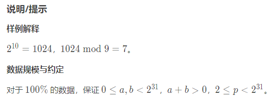 输出一行一个字符串 a^b mod p=s,其中 a,b,p分别为题目给定的值, s 为运算结果。