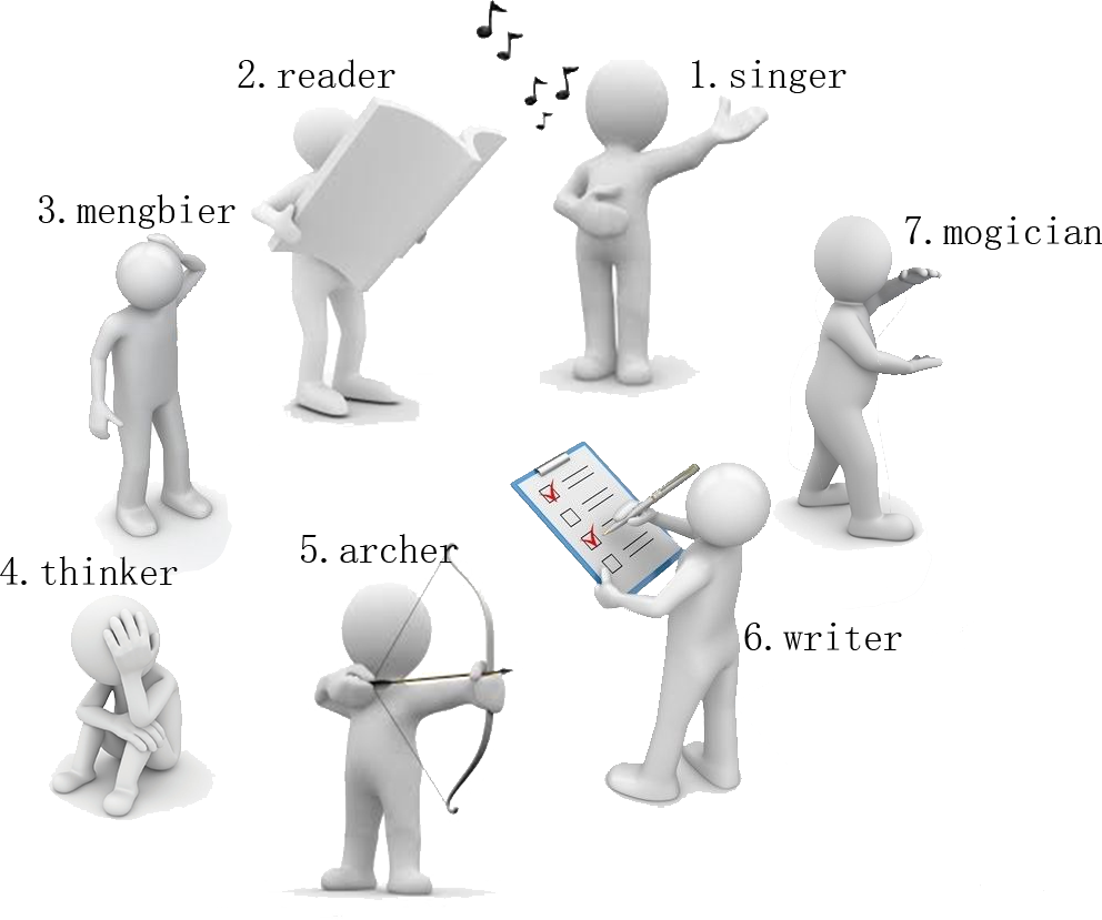 小南有一套可爱的玩具小人,它们各有不同的职业。