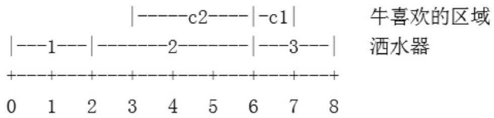 根据输入样例,一共有两头牛,山脊的长度为8。洒水器的喷洒半径为[1,2](即1或2)。一头牛喜欢3-6区域,另一头牛喜欢6-7区域。