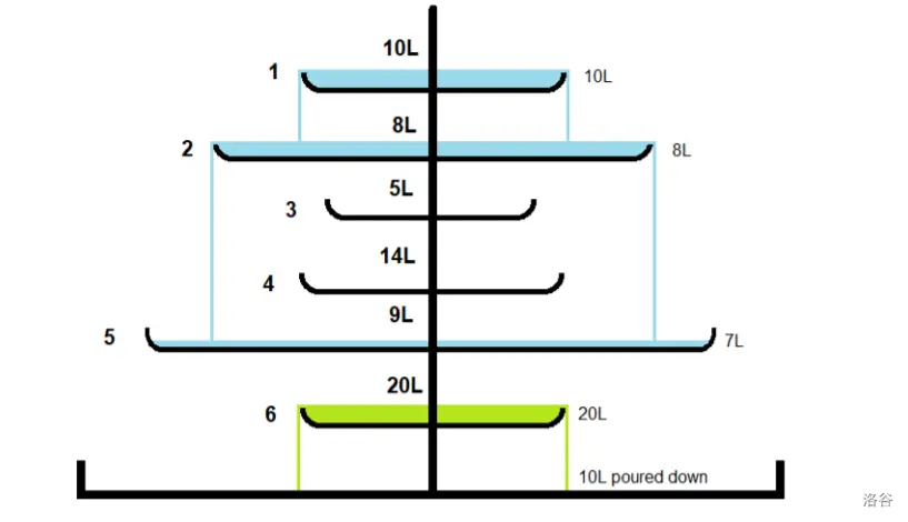 因为每个询问互不影响,对于第三个询问,第 5 个圆盘里的水不会溢出。