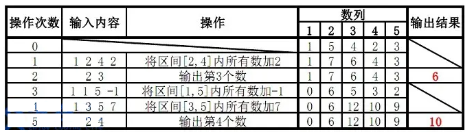 操作 1: 格式: 1 x y k 含义:将区间[x ,y ]内每个数加上 k;