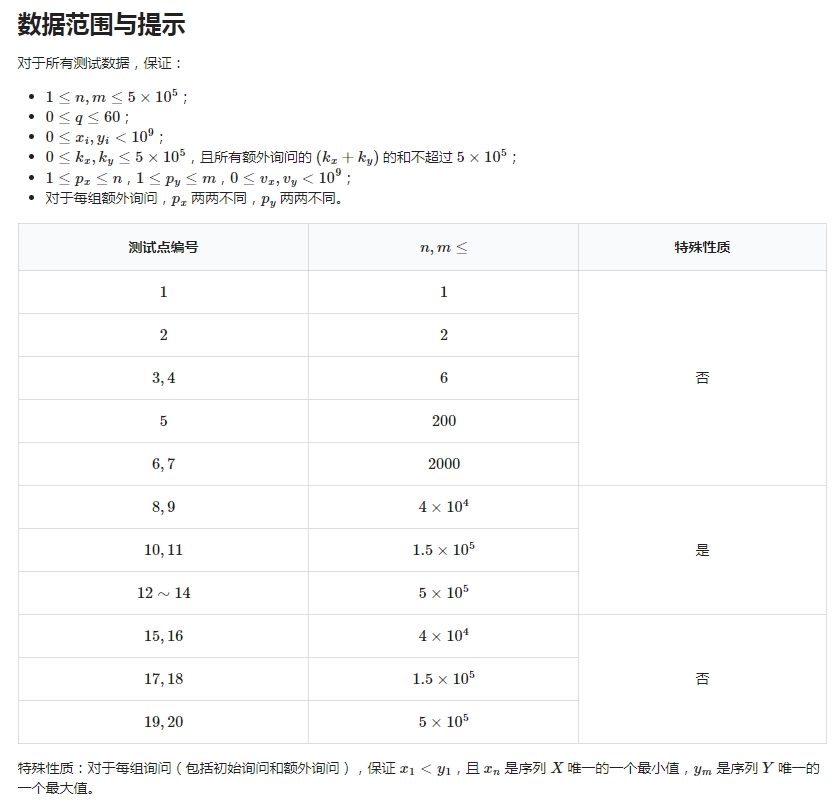 为了避免你扔硬币蒙混过关,小 R 还给了 q 次额外询问,每次额外询问中小 R 会修改 X 和 Y 中若干元素的值。你需要对每次得到的新的 X 和 Y 都进行上述的判断。