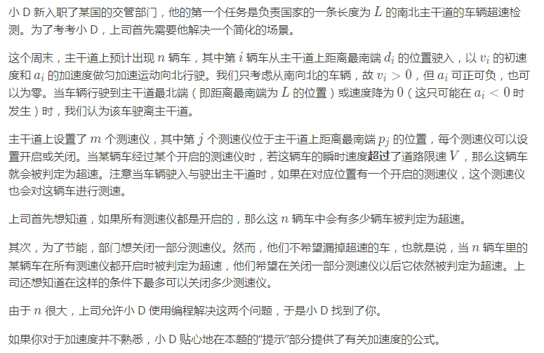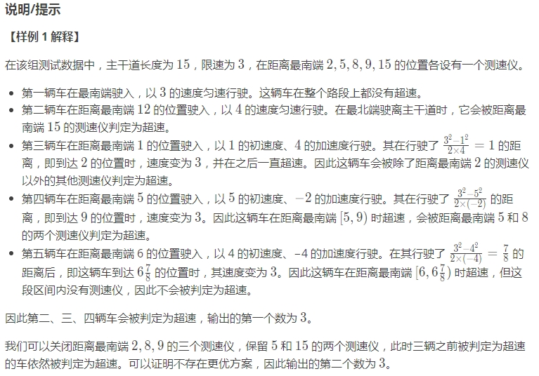 第二个整数为在不漏掉超速车辆的前提下最多可以关闭的测速仪数量。