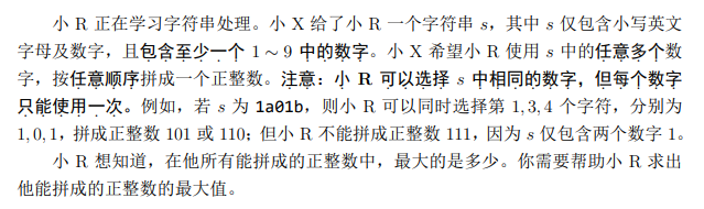 输出一行一个正整数,表示小 R 能拼成的正整数的最大值。