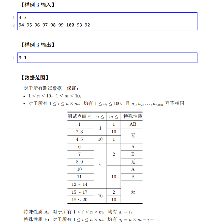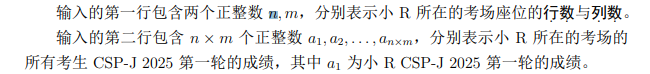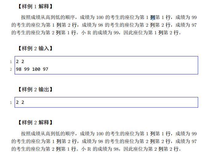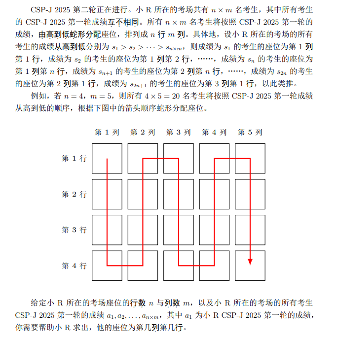 输出一行两个正整数 c, r,表示小 R 的座位为第 c 列,第 r 行。