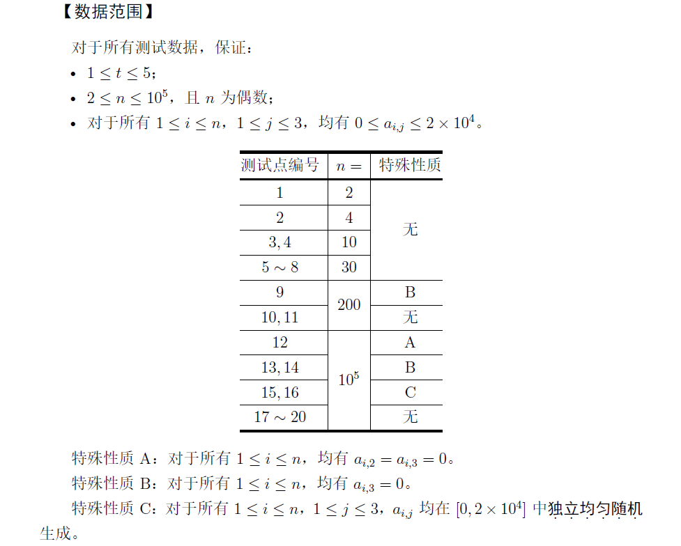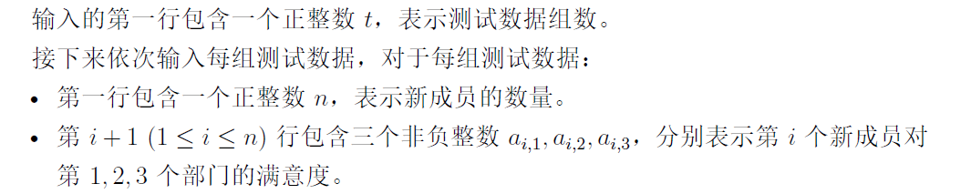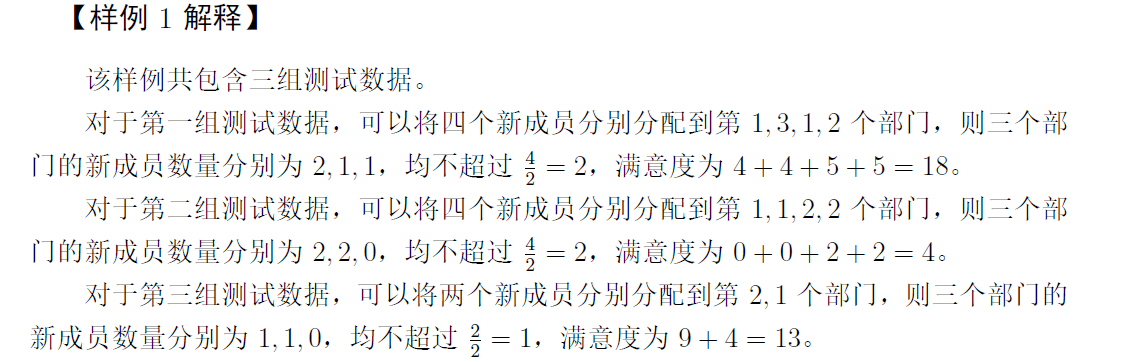 对于每组测试数据,输出一行一个非负整数,表示满足小 L 要求的分配方案的满意